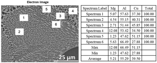 More detailed EDX point analysis confirmed that the concentration of Mg can reach up to 12 wt.% in the dendritic phase (see Figure 6 and Figure 7).