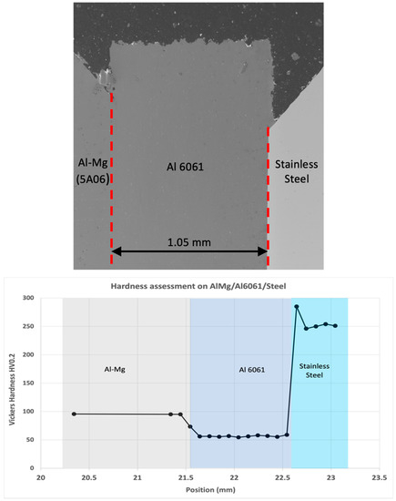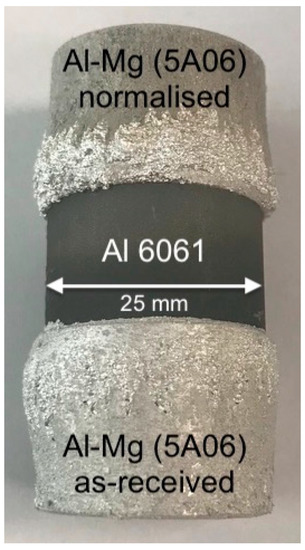 Al-5A06 alloy (equivalent to Al-5056) with a high magnesium content (5.8–6.8 wt.%) is one of the most widely used aluminium alloys in the transport and aerospace sectors due to its high specific strength and excellent corrosion resistance [11,12]. However, the high content of magnesium makes it one of the most difficult alloys to bond to other alloys. Very few attempts have been made to diffusion bond these family of aluminium alloy to steels. In this work, several methods to diffusion bond Al with 6 wt.% Mg alloy to stainless steel were developed, and the resultant microstructures and mechanical properties of the bonded sample were investigated.