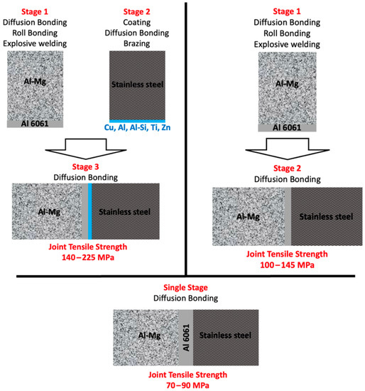 In the first stage, the Al-Mg alloy must be cladded with an Al-6061 plate (minimum 1 mm thick) by diffusion bonding (550 °C, 2 h, 5 MPa) or other methods such as roll-bonding. In the second stage, the Al-6061 side is diffusion bonded to stainless steel using the same conditions given for the above single-stage process. The bonded samples are expected to withstand tensile loads of up to 140 MPa.