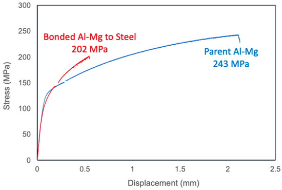 Using a complex cycle and multi-interlayers, bonds with tensile strengths up to 226 MPa were made. Figure 14 shows the stress vs. displacement of a tensile-tested sample made using a triple stage bonding cycle. The measured tensile strength of unbonded parent Al-Mg alloy was 243 MPa in the as-bonded condition. Figure 14 also shows that the elongation (not the strain) of the bonded bi-metal sample was less than that of the monolithic parent aluminium alloy. This is partly because half of the bonded sample was made of non-deforming steel. Therefore, in Figure 14, the elongation of the bonded sample should be multiplied by 2 before comparing it with that of the parent alloy.