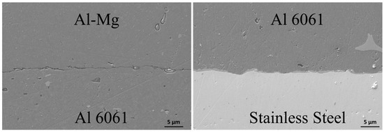 SEM micrographs show joint continuity in a bonded Al-Mg (5A06) to stainless steel (1Cr18Ni9Ti) sample. The presence of Al-6061, as a buffer layer, prevented the migration of Mg toward the surface of stainless steel.