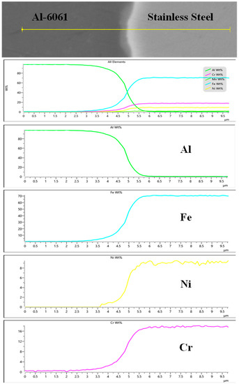 Figure 16 also shows that the steel to Al-6061 joint, as expected, contained thin and mostly continuous Al-Fe intermetallic phase. The formation of thicker and undesirable intermetallics must be avoided to prevent joint embrittlement.