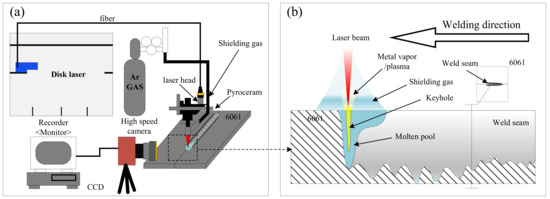Welding schematic diagram and welding equipment: (a) the schematic diagram of the laser welding plate butt joint; (b) the schematic diagram of laser deep penetration welding.