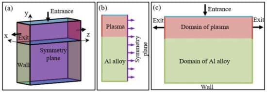 The calculation domain of the model proposed in this paper is shown in Figure 2, including entrance, exit, symmetry plane and wall. The YZ plane is the symmetric plane. The top region of the XY plane is the plasma region. The plane above the plasma region is the entrance, set to a constant speed. Both sides of the plasma region along Y direction and opposite side of symmetry plane are the exits, set to the isobaric surface. The region above the XY plane is the Aluminum Alloy area. The two sides of Aluminum Alloy area along Y directions, opposite side of symmetry plane and bottom are walls.