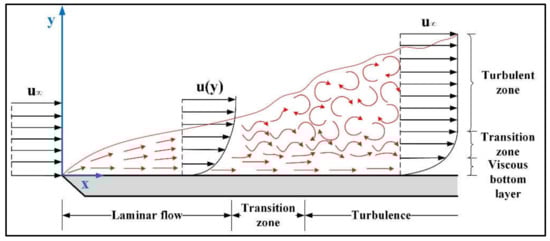 In the laminar boundary layer, the fluid motion is extremely regular. As the velocity increases, the boundary layer exhibits extremely irregular turbulent flow. As a result of the interaction that leads to the chaotic flow state, the velocity and pressure at any point in the turbulent boundary layer fluctuate. The variation of the velocity boundary layer on the plate is shown in Figure 3. In order to simplify the calculation, the liquid flow state is assumed to be laminar.