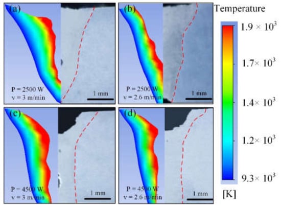 Verification results of thermal-flow coupling model in laser welding process of 6061 Aluminum Alloy plate butt structure: (a) P = 2500 W, v = 3 m/min; (b) P = 2500 W, v = 2.6 m/min; (c) P = 4500 W, v = 3 m/min; (d) P = 4500 W, v = 2.6 m/min.