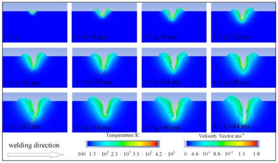 The vector arrow shows the flow trend of the liquid metal in the molten pool. At the top of the keyhole, the liquid metal flowed from the middle of the molten pool to the surrounding entire region, in which the Marangoni flow caused by surface tension absorbed energy from the middle to the surrounding area. Near the keyhole wall, a part of the liquid metal could flow between the surface of the liquid metal and the internal liquid metal due to the temperature gradient and the buoyancy, which played an important role. The other part of the liquid metal flowed along the keyhole surface, and the recoil pressure made the liquid metal flow upward to form a deeper keyhole. However, due to the short welding time and insufficient molten pool length, the Marangoni flow caused by surface tension made the liquid metal flow downward.