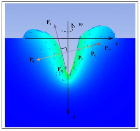 A point on the keyhole wall is selected for force analysis. The normal upward pressure on the point includes: metal vapor recoil pressure Pg, additional pressure caused by the surface tension of the curved liquid surface Pσ, liquid static pressure caused by gravity Pl, pressure caused by centripetal force considering the rotation of the molten pool Pc, and the laser beam impact force, which can be ignored. Shear force in the tangent direction includes shear force caused by tangential velocity F_s and shear force caused by surface tension gradient Fσ, as follows in Figure 7.