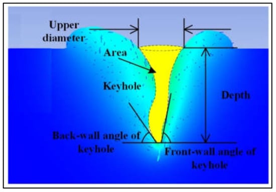 Illustration of keyhole shape with depth, outlet diameter of keyhole top, area of keyhole, front wall inclination angle of keyhole, and back wall inclination angle of keyhole.