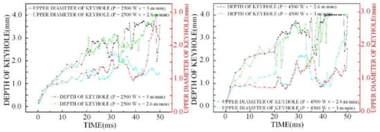 In this paper, the keyhole depth and the outlet diameter at the top of the keyhole under different process parameters are analyzed, and the following regulations are found, as shown in Figure 9 and Figure 10.