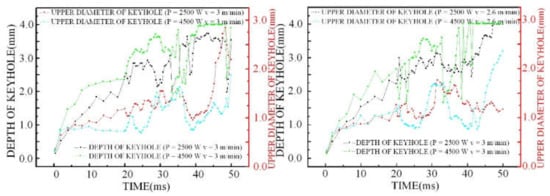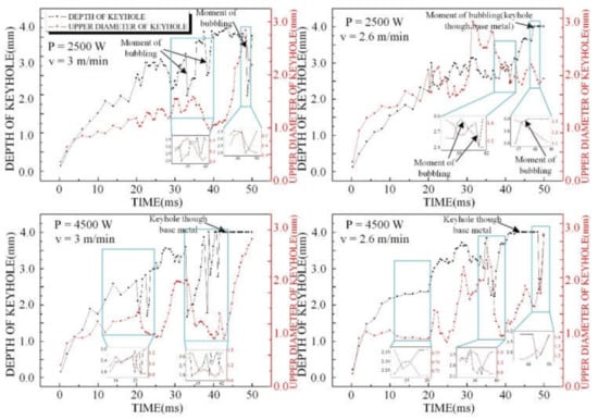 In addition, through the statistics of the keyhole depth and the outlet diameter of the keyhole top under different process parameters, it was found that bubbles were easily formed when the keyhole depth changed, as shown in Figure 11, along with the outlet diameter size of the keyhole top fluctuations.