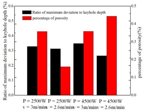According to Figure 11, by comparing the ratio of maximum deviation to the keyhole depth, it is concluded that the keyhole is relatively stable when the laser power is low. When the laser power is high, reducing the welding speed can make the keyhole relatively stable. When the laser power is high, the keyhole is relatively stable. However, the percentage of porosity is increased because the keyhole runs through the base metal leading the bottom of the keyhole to contact with the air and to enter the air. Therefore, the percentage of porosity is low when the keyhole stability is high.