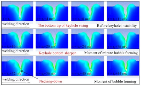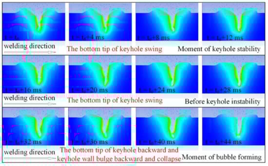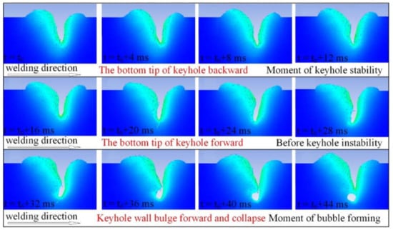 During the laser welding process, the tip of the keyhole’s lower part inclines forward when the keyhole is stable. Before keyhole instability, the tip of the keyhole bottom inclines, as shown in Figure 14.