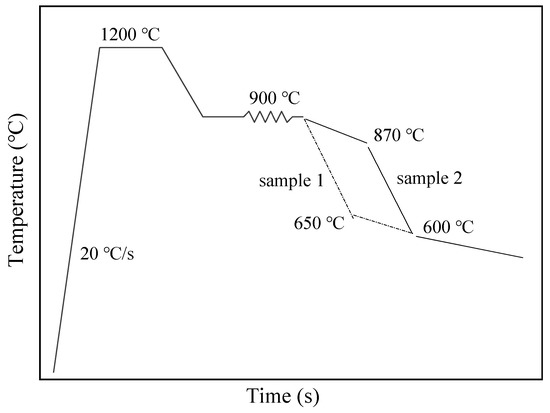 In this study, a Gleeble 2000 thermal analogue (DSI, St. Paul, MN, USA) was used for the continuous cooling test. Since the heating rate had no obvious effect on the microstructure of the experimental material, in order to improve the efficiency, the sample was heated to 1200 °C at 20 °C/s. According to our previous experimental experience [18], the soaking time was kept at 3 min for the sample to completely austenitized. After being cooled to 900 °C at a cooling rate of 20 °C/s and then subjected to unidirectional static compression simulation rolling with a 0.2 strain at a rate of 1 s−1, the sample cooled to 600 °C with two different cooling methods and then air-cooled to 200 °C to simulate the coiling process, as shown in Figure 1.