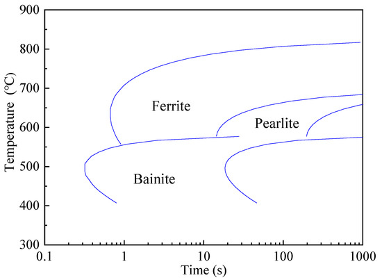 The thermodynamic calculation method was used to calculate the TTT curve of the components shown in Table 1, as shown in Figure 2. The results show that under equilibrium conditions, the transition nose tip temperature of ferrite is 637 °C, and the incubation time is 0.67 s. The higher is the temperature, the longer is the incubation time of ferrite transition. When the temperature decreases, the incubation time increases. After the temperature drops to 557 °C, bainite transition occurs.