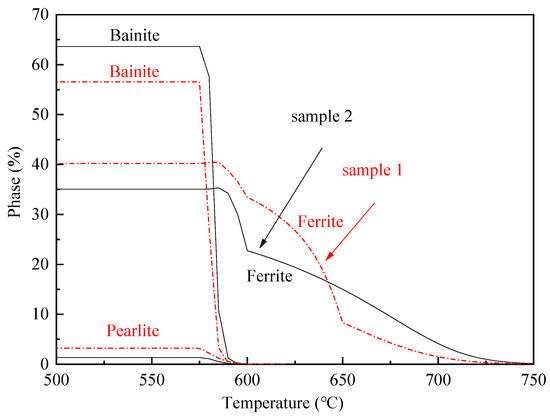 The phase transition curve was calculated according to the process shown in Figure 1, as shown in Figure 3. Sample 1 started to cool at 900 °C, and then quickly cooled to 650 °C. Due to the fast cooling, less phase change occurred, but after the temperature reached 650 °C, the air-cooling time became relatively long. This temperature was close to the ferrite transition “nose tip” temperature, residual austenite rapidly transformed to ferrite, and the proportion of ferrite increased significantly. Ferrite completed 33.4% transition before coiling at 600 °C. During the subsequent cooling process, the structural stress of the hot-rolled coil was significantly reduced.