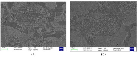 In order to further analyze the difference of structure transition with different cooling methods under industrial production conditions, the microstructure is analyzed by SEM in this study, as shown in Figure 6. It is found that ferrite transition is more sufficient with the front-section fast cooling method, as shown in Figure 6a; ferrite has the typical proeutectoid morphology; the interior of ferrite is relatively clean; and a complete continuous transition of ferrite occurs along the austenite grain boundary. Ferrite is adjacent to the typical pearlite structure and, finally, transforms to the internal bainite structure. The sample produced by the rear-section fast cooling method has a significant reduction in the proportion of ferrite and also presents the characteristics of intergranular proeutectoid transition, as shown in Figure 6b. However, the transition of ferrite is less, and the proportion of pearlite increases significantly.