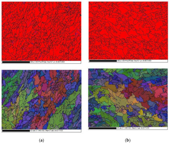 In order to characterize the effect of the cooling process on the structure grain size, EBSD (Bruker, Saarbrucken, Germany) is used to analyze the effective grain size, as shown in Figure 7. The results show that the effective grain size obtained by the cooling method in process 1 has a remarkable refining effect, which is beneficial to improve the comprehensive properties of materials. This is more consistent with Abdullah’s [16] findings.
