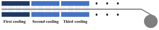 In the process of industrial production, the distance between the finishing mill and the coiler is fixed. Normal production usually takes about 10 s. When the finishing rolling temperature and coiling temperature are fixed, the average cooling rate is fixed, and the phase transition is completed within 10 s. During coiling, more retained austenite leads to an increase in the proportion of phase transformation in the subsequent process, so the expansion caused by the structural transformation also increases, which leads to the phenomenon of coil collapse. Reducing the proportion of retained austenite during coiling can effectively solve the problem of coil collapse. In other words, a higher fraction of ferrite transformation during cooling is beneficial to the improvement of coil collapse. In order to meet different production control requirements, the cooling equipment of the hot tandem mill is generally divided into several sections, as shown in Figure 8. Usually, strip steel in the first section has the highest temperature and the strongest cooling capacity, which is used to produce pipeline steel and other products [22,23,24]. When producing cold-rolled products, a uniform cooling method is used to control the shape. Conventional production avoids the first-section cooling and starts with the second-section cooling (i.e., the process 2 method described in this research).