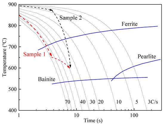 The average cooling rate in two processes is the same, and the cooling process in the actual production between the finish rolling and the coiler is simulated, the residence time is 10 s, and the temperature is reduced from 900 to 600 °C for coiling, which means that the average cooling rate of the two methods is the same.