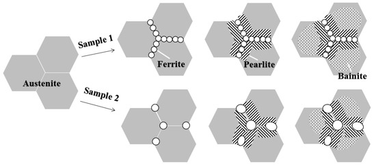 As shown in Figure 9, the continuous cooling transformation (CCT) curve is calculated for the sample, and the phase transition process of samples 1 and 2 is shown too. According to the TTT curve shown in Figure 2, the “nose tip” temperature of ferrite transition of the sample in this study is 637 °C, and the incubation time is only 0.67 s. When considering that the increase in strain is beneficial to ferrite transition, the ferrite transition temperature in the actual production is slightly higher than the theoretical calculation temperature. Therefore, the sample was cooled quickly to this temperature range and kept there; high undercooling is conducive to ferrite nucleation, as shown in Figure 10. At the austenite interface, ferrite nucleates rapidly, and the ferrite grain size is fine [25]. As mentioned in process 1 in this research, fast cooling is selected to be 650 °C, and the results of simulation and industrial tests show that the ferrite structure is relatively small and the ferrite transition is more sufficient. Compared with process 2, when entering the ferrite transition region at a relatively high temperature, the thermodynamic conditions are sufficient, but the dynamic conditions are insufficient. The undercooling degree is small, and the ferrite transition occurs only a few seconds before coiling, as shown in Figure 10. Therefore, ferrite still nucleates and grows at the austenite interface, but the nucleation rate decreases, the ferrite transition is relatively insufficient, and the proportion of ferrite in the final structure is relatively reduced. As shown in sample 2 in Figure 9, the amount of ferrite transition before final coiling in process 2 is significantly less than that in process 1. The simulation test results, theoretical calculation results, and field test results all verify this rule.