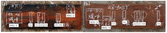 The specific sampling locations are shown in Figure 2. C1–C5 samples were used for crack morphology and microstructure analysis, of which three samples were taken from the crack area (sample numbers are C2, C3, and C4), and one was taken away from both ends of the crack (sample numbers are C1 and C5). The three samples in the WSI 1-3 area were used for the impact toughness analysis of the weld zone. The three samples in the BSI 1-3 area were used for the impact-toughness analysis of the base metal.