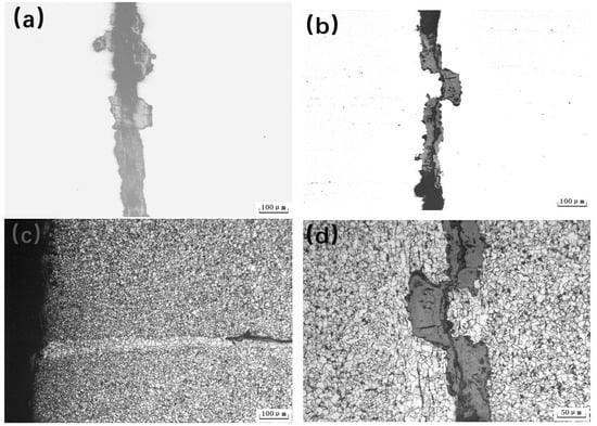 The morphologies of the side cracks of the 1# cracking pipe in the C1–C5 samples were observed. As shown in Figure 3, the cracks on the side of sample C2 had completely penetrated the pipe wall, and the cracks gradually expanded from the inner wall to the outer wall. The crack morphology was invisible on the side of sample C4. This condition shows that the cracks propagated from the outer surface of the pipe wall to the inner surface. Analysis of the microstructure near the cracks showed that the cracks spread along the fusion line of the weld, and many inclusions occurred in the cracks (Figure 4).