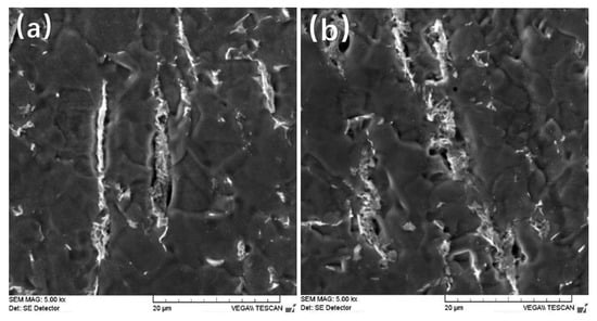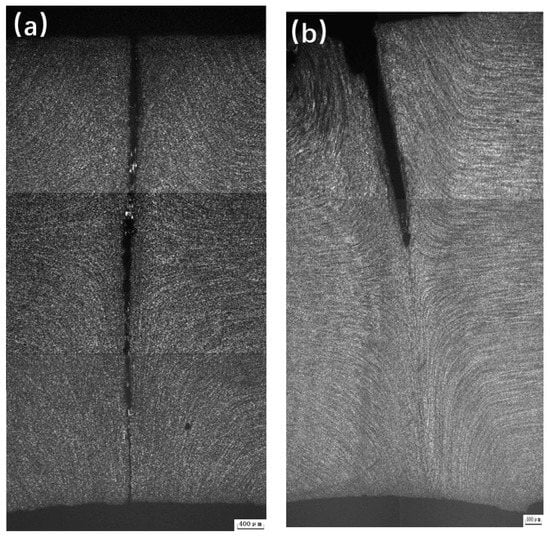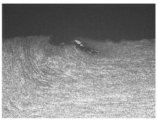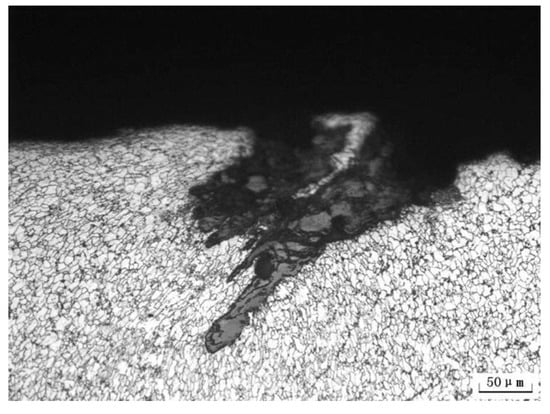 The streamline morphology of the welding seam was analyzed for the 1# and 2# cracking pipes. As shown in Figure 12a, the streamline morphology of the 1# cracking pipe sample meets the criterion. The fusion line was not obviously inclined, the rising angle of the streamline at the weld did not appear too steep or too flat. The streamline morphology on both sides of the fusion line was symmetrical. The streamlines on the side near the outer surface have double peaks, and the width of the waist drum in the heat-affected zone was moderate. Figure 12b shows that the fusion line of the weld seam of the 2# cracking pipe sample was seriously inclined because of the unbalanced pressing force. The streamline morphology was asymmetric on both sides of the fusion line and the rising angle of some streamlines was extremely large, accompanied by double peaks, and the width of the waist drum in the heat-affected zone was moderate. At the same time, the small cracks near the outer surface of 2# pipe in Figure 6 were due to the turning of the outer surface of the steel sample on the side of the fusion line, as shown in Figure 13.