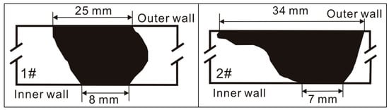 The crack morphology of the C2–C4 samples of the 1# and 2# pipes can be combined, and the fracture morphology of the original pipe wall of the two cracking pipes can be obtained, as shown in Figure 7.