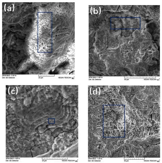 Morphology of inclusions at crack source. (a) zone 1; (b) zone 2; (c) zone 3; (d) zone 4.