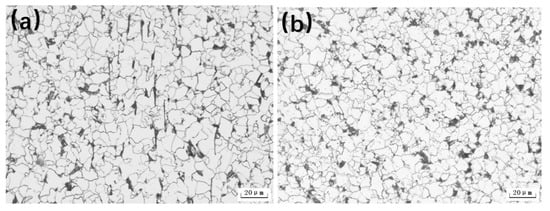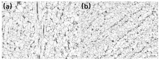 According to the standards GB/T13298-1991, GB/T10561-2005, and GB/T6394-2002, MEF4M metallographic microscope and image analysis system were used to observe the welding parts of 1# and 2# cracking pipes, as shown in Figure 9 and Figure 10. The microstructure of the weld zone and heat-affected zone was mainly ferrite (F) and pearlite (P). The grain size of the weld zone was higher than grade 9.5, and the grain size of the heat-affected zone was grade 10.5, which met the design requirements. However, gray inclusions in the fusion line were distributed in a shuttle-shaped chain along the direction of the fusion line, that is, the so-called gray spot of weld oxide inclusions with a length of 20–40 μm.