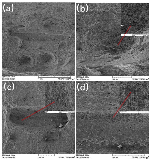 SEM morphology of tensile fracture: (a) “Gray spot” (bottom) and separation (top) of 1# cracking pipe welds; (b,c) “gray spot” of 2# cracking pipe welds; (d) fracture separation of 2# cracking pipe weld.