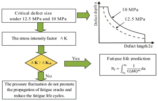 The pipe-body fatigue behavior is particularly prominent due to the flat-type defects from the straight welding seam and the variable load from shutdown and restart and operating pressure fluctuations. The remaining life is mainly decided by the fatigue life of the cracking pipeline. Figure 15 shows the system flow of fatigue life prediction for pipelines with potential cracking risk. First, the critical defect size of the pipeline under two pressures of 12.5 MPa and 10 MPa was determined based on the FAD system. The critical defect size at 12.5 MPa is the maximum size of potential defect in an operating pipeline. The critical defect size at 10 MPa is an unacceptable defect size for an operating pipeline. Then, whether shutdown and startup and pressure fluctuation cause crack fatigue growth were judged. If the stress-intensity factor ΔK exceeded the fatigue threshold ΔKth, the fatigue life and reassessment cycle of the pipeline where the cracking pipe was located were predicted based on the results of the fatigue-crack growth rate.