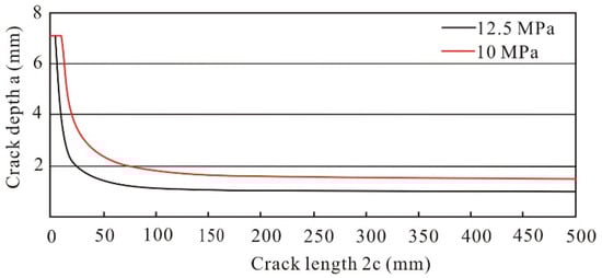 Based on the API 579 (Fitness for Service), the critical defect size of the pipeline under the test pressure of 12.5 MPa and the design pressure of 10 MPa is calculated and shown in Figure 17. The critical defect size of the pipeline at 12.5 MPa and 10 MPa is a curve controlled by the two parameters of crack depth a and crack length 2c.
