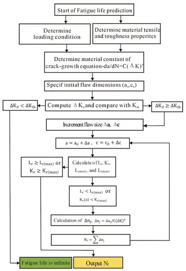 As shown in Figure 18, the first important step of fatigue life prediction is to determine whether the initial crack propagates under the given conditions. If no propagation occurs, the fatigue life is infinite. Otherwise, the increment (Δa, Δc) of a certain crack size is given based on the initial crack (a0, c0), and the life increment is calculated by virtue of Paris crack-propagation formula. Safety-assessment software (TGRC-AFSP) developed by us is used to calculate the pipe fatigue life. At each step of the life numerical integration, the two parameters (Lr, Kr) of the FAD diagram are used as the criteria of failure conditions. The accumulation and approximation methods are combined to predict the evaluation period.