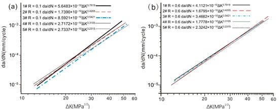 The measure values of three specimens from the same pipe section were fitted, and the results are shown in Figure 19. The fatigue-crack growth rate when the stress ratio R was 0.6 is higher than the fatigue-crack growth rate when the stress ratio R was 0.1, and the crack growth rates of different steel pipes under the same stress ratio are not much different.