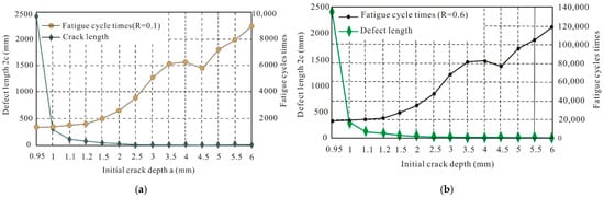 Relationship between pipeline cycle times and initial crack depth (a) R = 0.1; (b) R = 0.6.