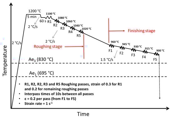 The interval between passes was 10 s. Another four roughing passes (R2, R3, R4 and R5) were applied at temperatures of 1080, 1060, 1040 and 1020 °C, respectively, and strain 0.2 and a strain rate of 1 s−1. The finishing passes (F1, F2, F3, F4 and F5) were applied at temperatures of 960, 945, 930, 915 and 900 °C with time between passes of 10 s and the same strain and strain rate as in the four last roughing deformations. Note that all simulations were carried out inside the austenite phase field, and the last strain of the finishing stage was 70 °C above the Ae3 temperature. After passes 1, 3 and 5 of both the roughing (R) and finishing (F) stages, the material underwent ultra-rapid cooling by a continuous flow of water on the specimens in order to preserve the microstructure for further analysis. Figure 1 illustrates the thermomechanical processing simulation process.