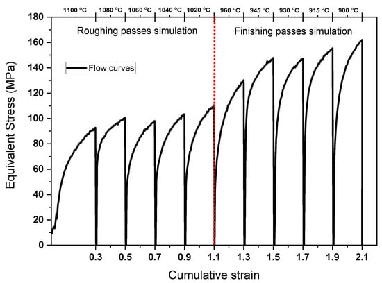 The stress–strain curves obtained from the five-pass simulations related to roughing passes, together with the five-deformation regarding the finishing stage of the thermomechanical process, are illustrated in Figure 2.