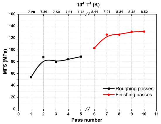 where σeq is the equivalent stress and (εf − εi) is the equivalent strain applied in each pass. The results of the MFS values in the curves of the roughing and finishing stages for API X80 steel are shown in Figure 3.