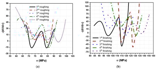 Previous researchers have shown by means of microstructural characterization that the first presented minimum in the (−dθ/dσ) versus (σ) charts is associated with the beginning of DT while the second minimum determines the onset of DRX [4,5]. The second derivative curves obtained from the flow curves related to the roughing and finishing stages of the simulation are presented in Figure 4a,b, respectively.