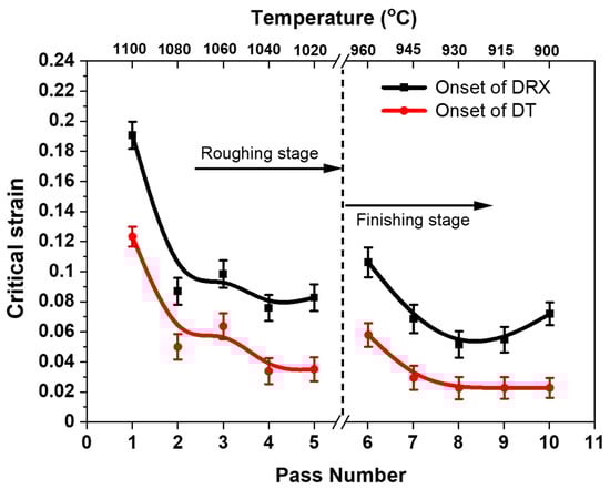 After finding the stresses of the two minima in Figure 4, these were correlated to their respective strains in the flow curves. The quantity of strains (named as critical strain) where DT and DRX initiated were then plotted with their corresponding pass number; see Figure 5. Note that the roughing and finishing stages of the simulation are highlighted in the chart, as are the temperatures of the employed deformations. For all passes, the critical strain for the onset of DT was lower than that of the DRX, which reflects the first and second minima of the second derivate curve. Both the DT and DRX critical strains (0.12 and 0.19) were higher in the first pass of the roughing stage and decreased as the number of passes increased, reaching values of approximately 0.04 and 0.09, respectively.