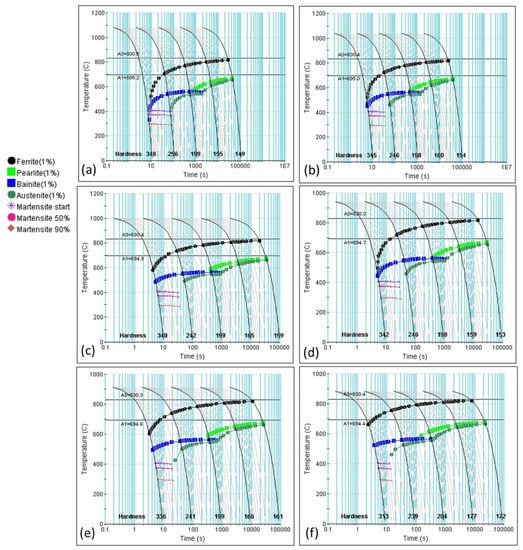 Calculated continuous cooling transformation (CCT) diagrams of the API X80 quenched from (a) 1100 °C with a grain size of 75 μm; (b) 1060 °C with a grain size of 60 μm; (c) 1020 °C with a grain size of 35 μm; (d) 960 °C with a grain size of 53 μm; (e) 930 °C with a grain size of 31 μm; and (f) 900 °C with a grain size of 17 μm. All simulation was conducted above the Ae3 temperature.