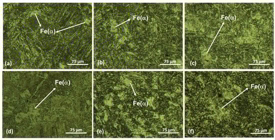 Image analysis is an important method for the characterization of materials. In the study of dynamic transformations (DT), it constitutes a powerful technique for visualizing the formed phases and calculating their volumetric fractions. The optical microscopy results are depicted in Figure 7. Images that correspond to samples quenched after the R1, R3 and R5 of the roughing strains and the F1, F2 and F5 passes of the finishing stage simulations are shown in Figure 7a–f, respectively. The brighter areas are DT ferrite while the darker regions are martensite (austenite at elevated temperature, which was transformed during quenching). The arrows indicate ferrite (Fe(α)) islands surrounded by austenite (α). It can be noted that optical images were chosen for volume fraction measurements of the phases where a quantity of 10 to 15 images per sample were used; these results are presented later.