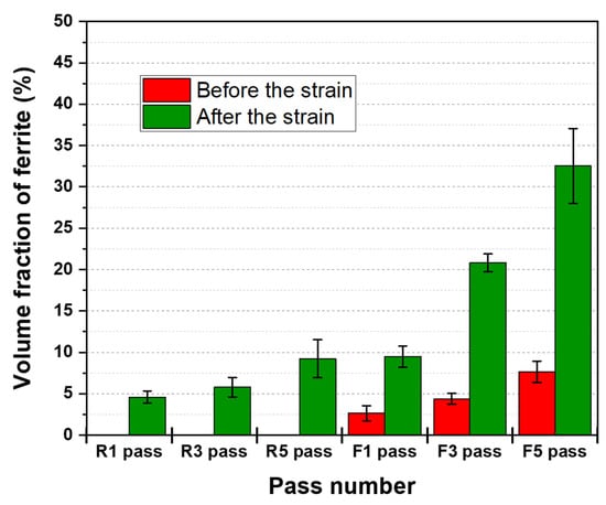 The cumulatively calculated volume fraction of dynamically transformed ferrite determined from the OM images after the R1, R3, R5, F1, F3 and F5 passes and before the commence of the F1, F3 and F5 strains are displayed in Figure 8.
