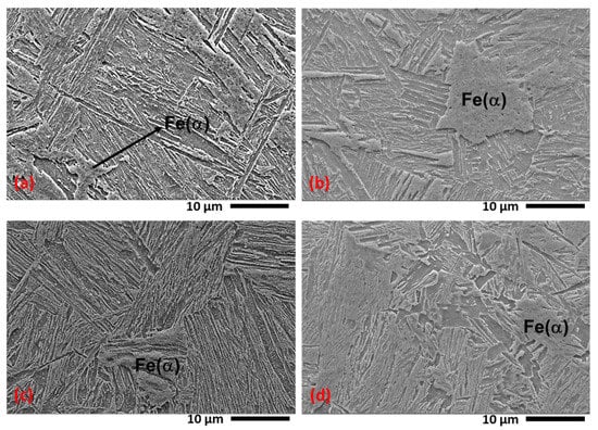 Figure 9 shows the SEM microstructure of the torsion specimens sectioned transversely after the first (Figure 9a) and fifth (Figure 9b) roughing passes, as well as after the first (Figure 9c) and fifth (Figure 9d) passes of the finishing stage of the thermomechanical simulation. It has already been shown that DT ferrite first forms as Widmanstätten ferrite plates at the critical strain and coalesces into polygonal shapes as the strain is continued after the critical strain. Ferrite structures are highlighted in the images. It can be noted that most of the presented ferrite was in the form of polygonal shapes. This means that this phase had already passed through coalescence while under strain. From a qualitative evaluation, it is clear that the last passes produced more DT ferrite due to strain accumulation and as the temperature approached the Ae3 line.