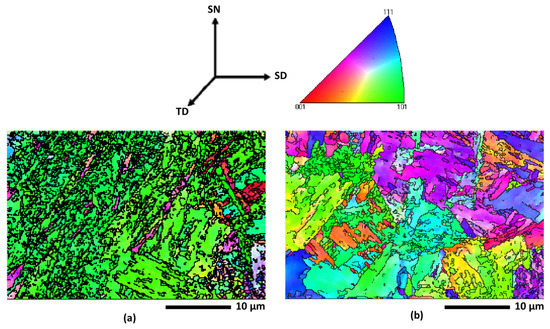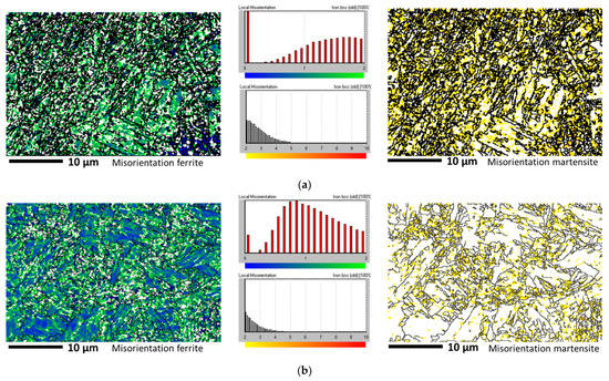 Qualitatively, it can be seen that there was more ferrite after the last finishing pass than the last roughing strain during the thermomechanical simulation. The blue and green colors indicating ferrite (misorientation <2°) occupy more space after the F5 pass, while the yellow to orange colors of martensite and of untransformed austenite are much more pronounced after the R5 pass. These results agree with the OM analyses and volume fraction calculation shown in Section 3.5.