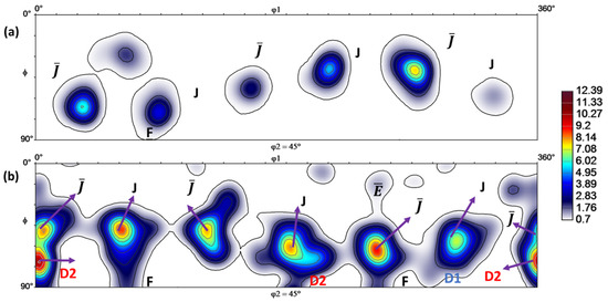 The ODF sections of the tested samples after the R5 and F5 passes, based on EBSD data, are shown in Figure 14a,b, respectively. After the roughing simulation, the preferable crystallographic orientation presented relative moderate intensities around the main components , and a lower intensity around component ; see Figure 14a. It has been shown that the two J components formed first at lower strains, and consequently, showed the lowest rotation rates [37].