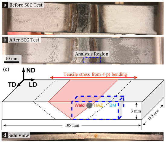 Figure 1. (a,b) Surface morphology of test coupon before and after immersion in boiling magnesium chloride; (c) schematic illustration of the coupon dimension and welding zones; (d) side view of the test coupon after boiling magnesium chloride immersion, with a major crack appearing to the right of the weld seam (adapted from Reference [27]).