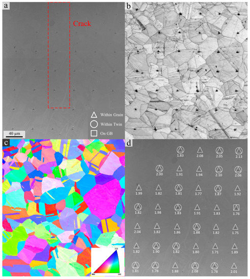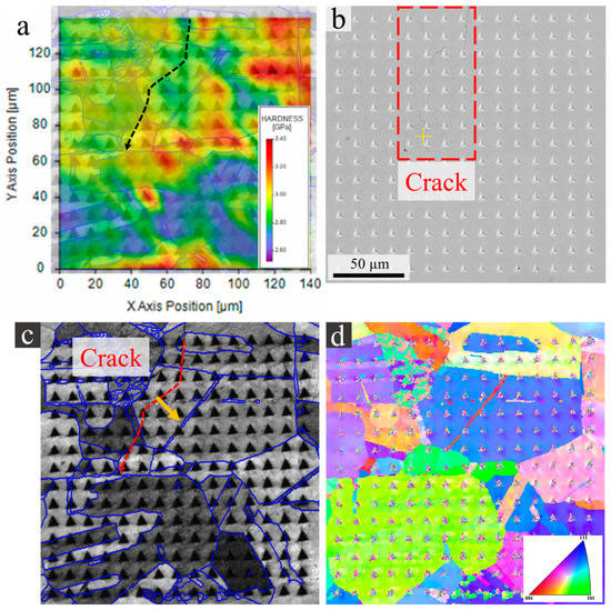 Figure 4. Nanoindentation and EBSD maps of crack #1 region. (a) SEM image with crack marked in red; (b,c) EBSD-IQ and IPF maps showing the grain structure; (d) SEM image annotated with hardness and triangle indentation position, with circle and square marks indicating that the corresponding indent is located on GBs or within a twin, respectively.